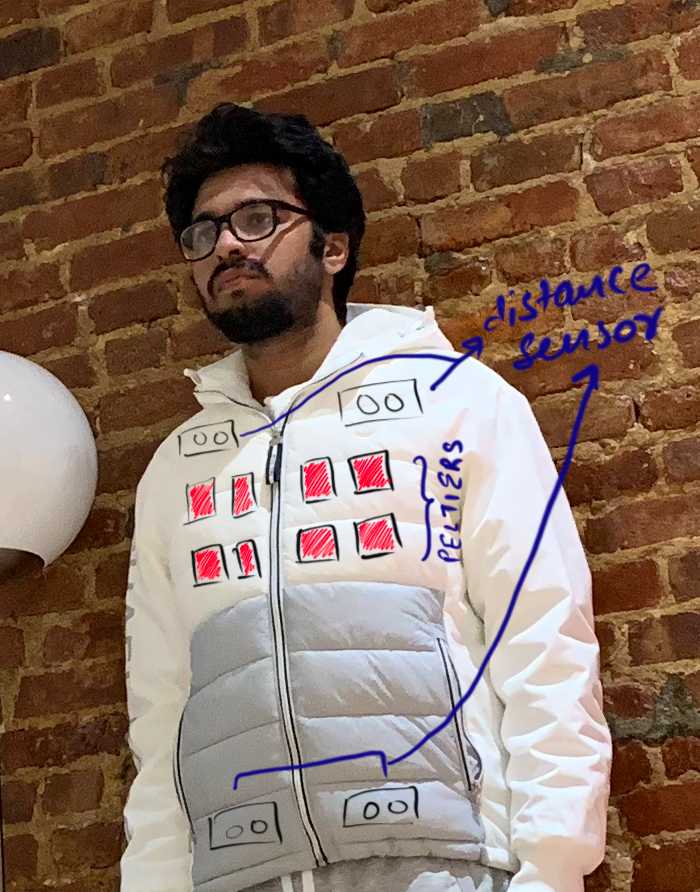 To implement peltiers I used a jacket and planned to embed peltiers inside it so they generate warmth or cold depending upon the distance. I intended to use a jacket because while having a conversation with people at lighthouse guild, I realized that cane also feels like a dependency to them. This led me to idea of embedding sensors and data inside a wearable. This jacket also houses a distance sensor/mini-LiDAR to detect objects in front of the person wearing it.