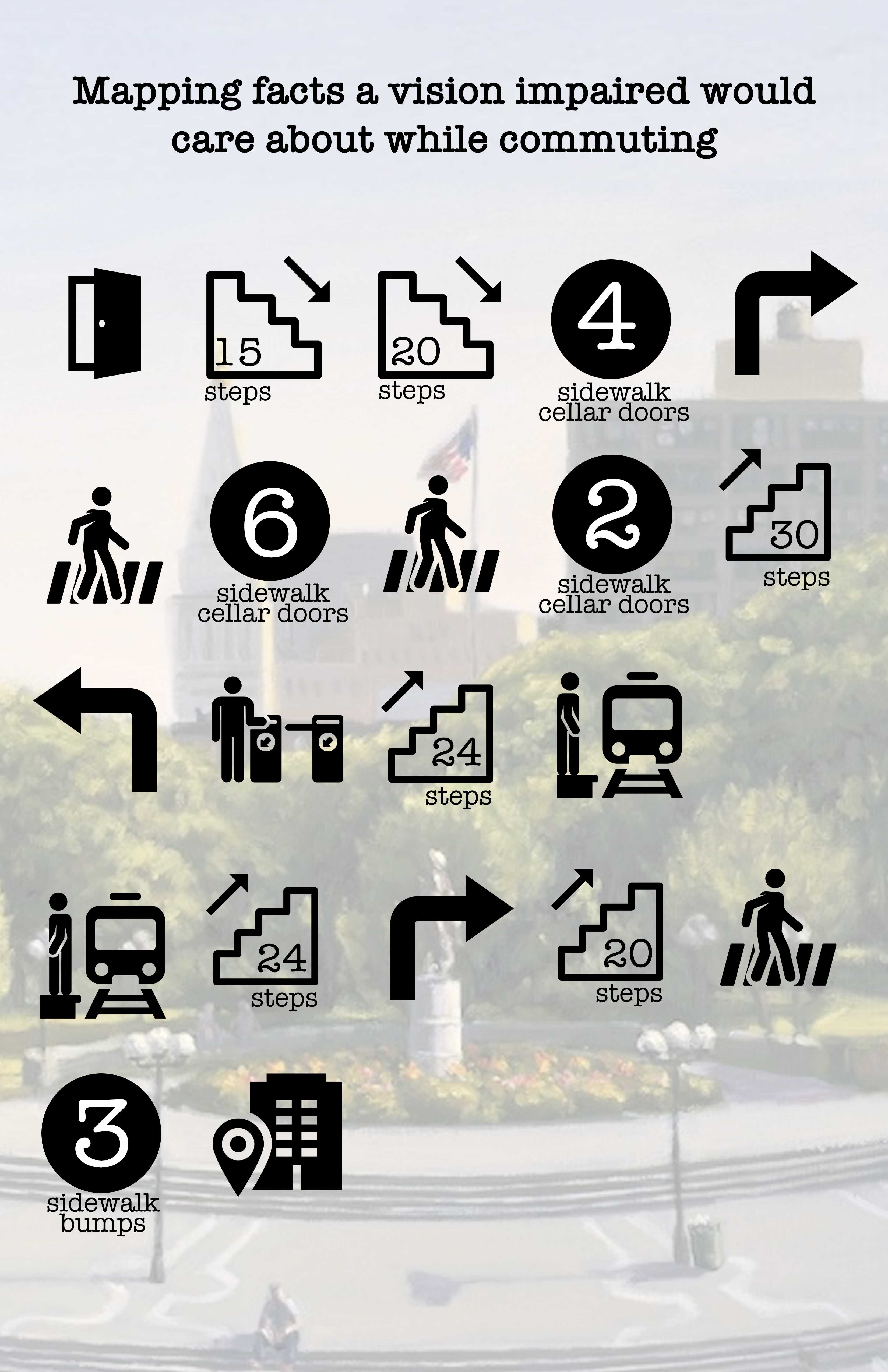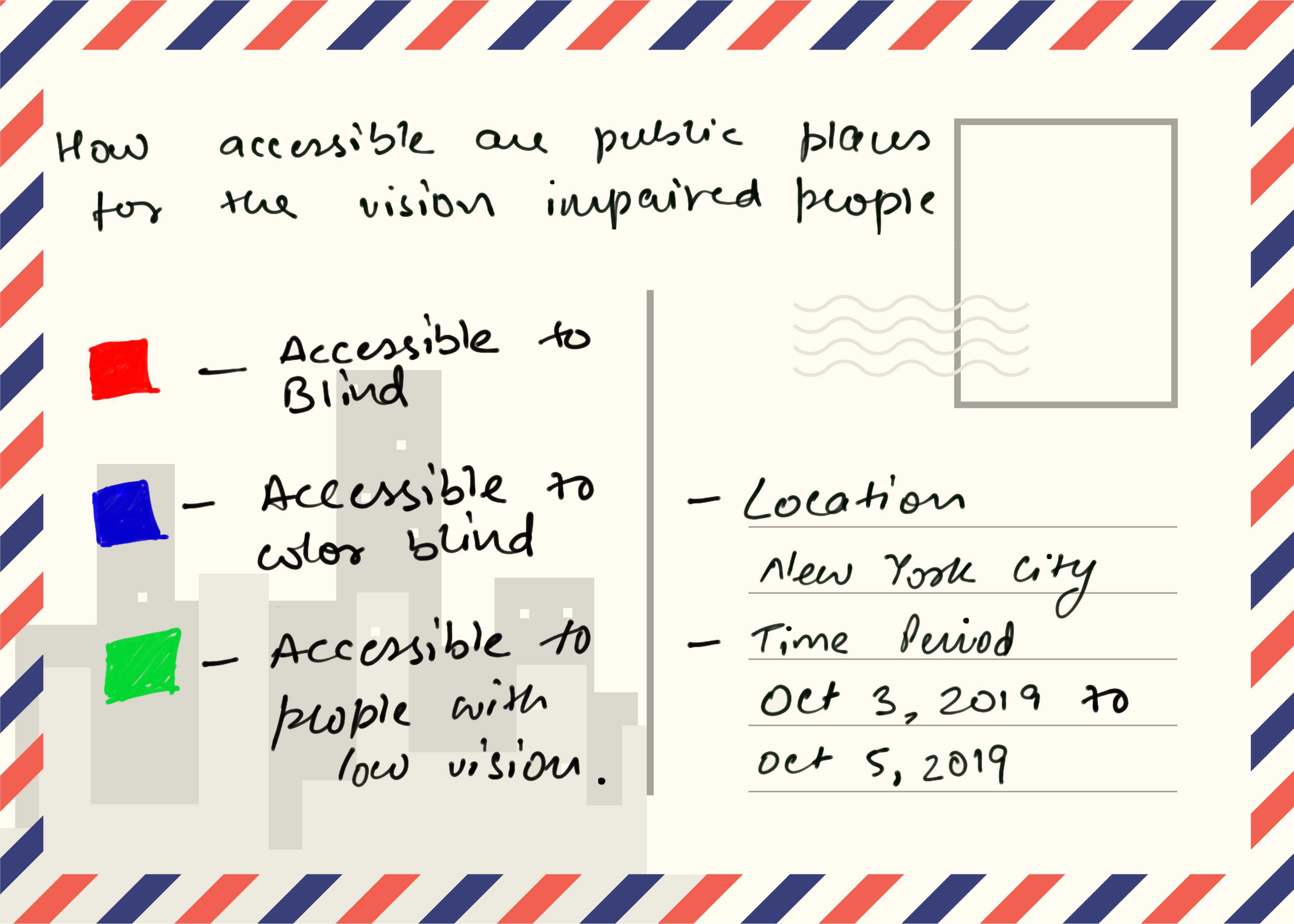 To explore how well public places are accessible to visually impaired people I made a note of places accessible to the blind, people with low vision and people with color blindness. I collected this data from my way home to school from October 3, 2019 to October 5, 2019.